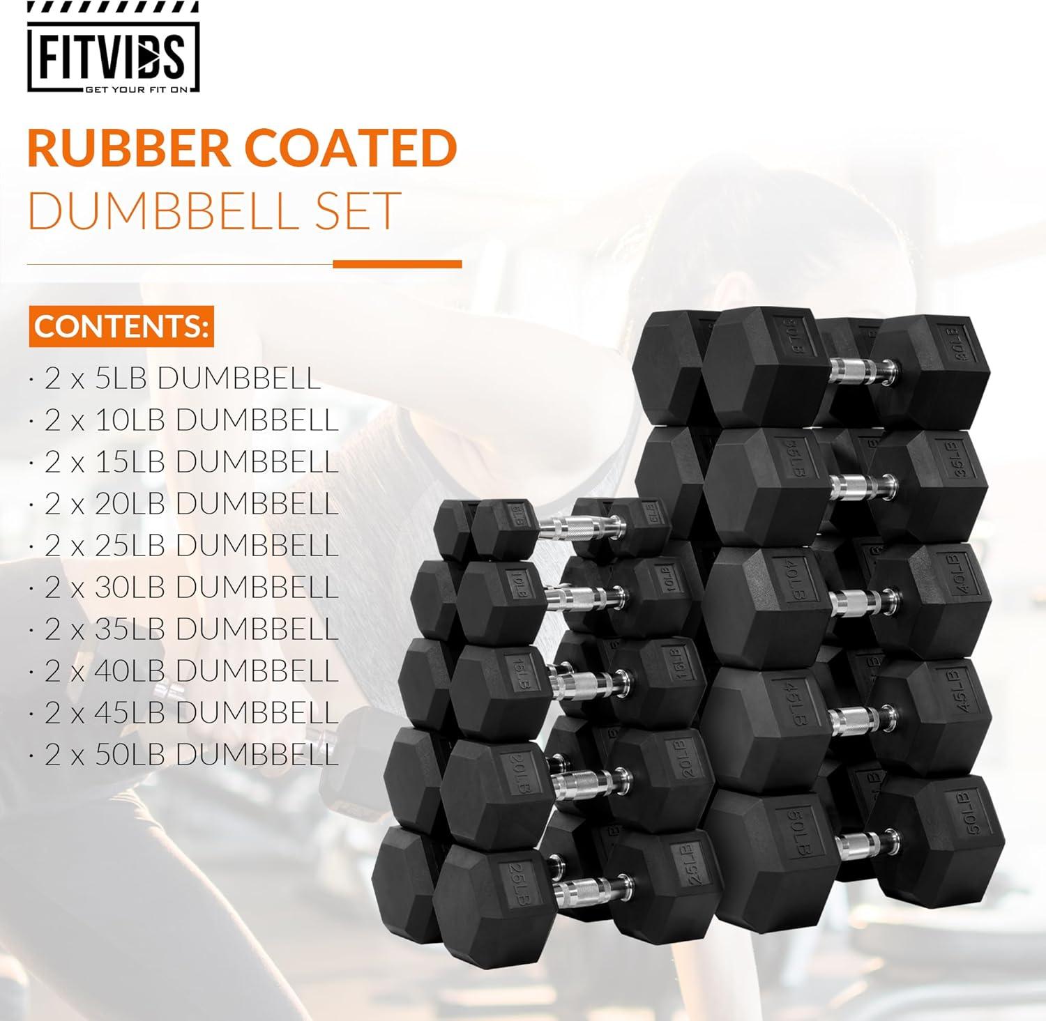 Fitvids Rubber Encased Hex Dumbbell Set Contoured Handle for Muscle Toning, Strength Building & Full Body Workout, 60LB, 100LB, 150LB and 550LB Set(550LB Set (5-50LB Pair))