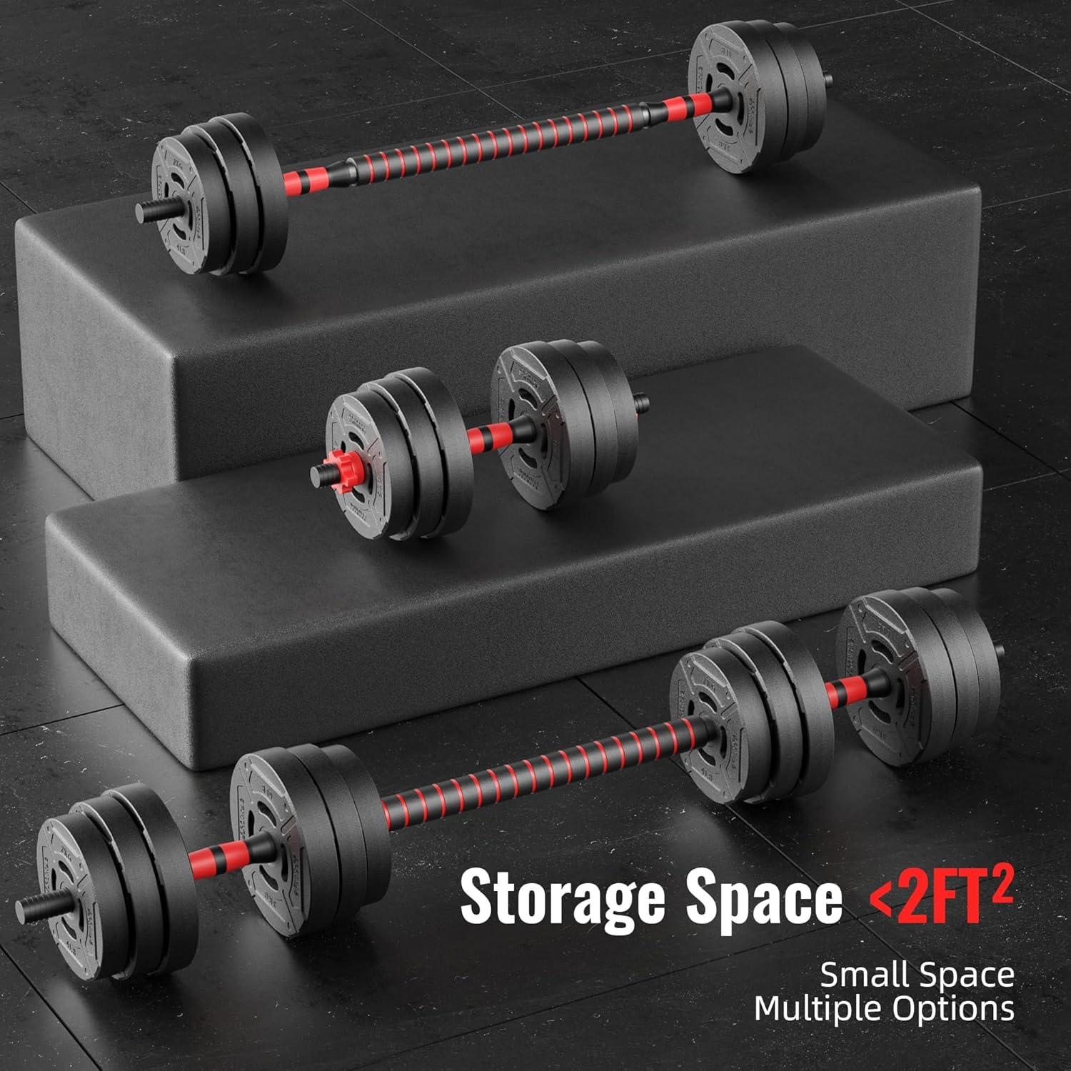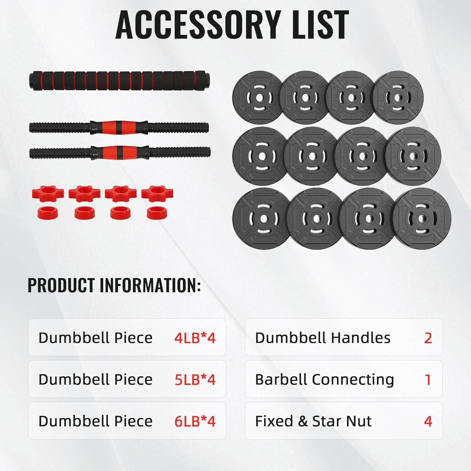 C​ontents – Set of 2-in-1: Four 4LB plates, four 5LB plates, four 6LB plates, two dumbbell handles, one barbell connector, four collar locks