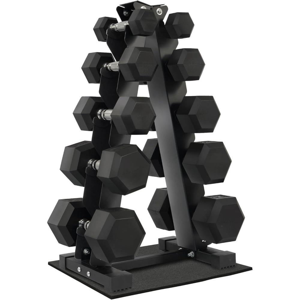 150 pounds set: 1x A-Frame rack (5-tier), pair of 5lbs, 10lbs, 15lbs, 20lbs and 25lbs
